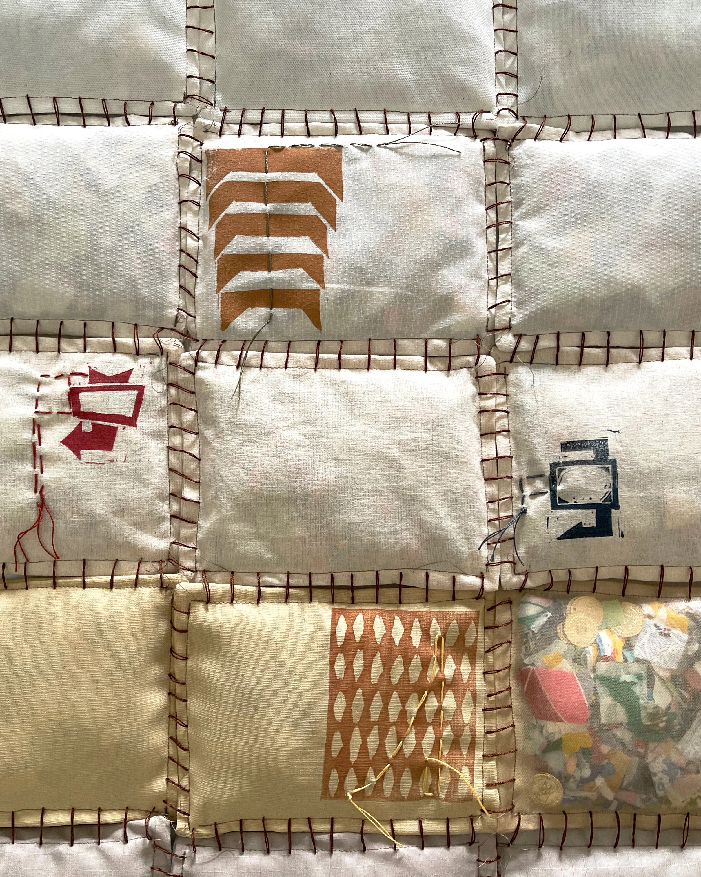“Beiz 1” is a patchwork made up of several beiz (homemade mittens often crafted to carry hot household items) stitched together. The fabrics are sourced from Block 1 in the Blockat district in Kuwait City, providing a snapshot of the current offerings in this area. Arranged in a grid formation, the piece alludes to the permanence of architecture, however the connections and threads are kept loose as a reminder that even though buildings are often thought of as stoic they are in fact ever changing.